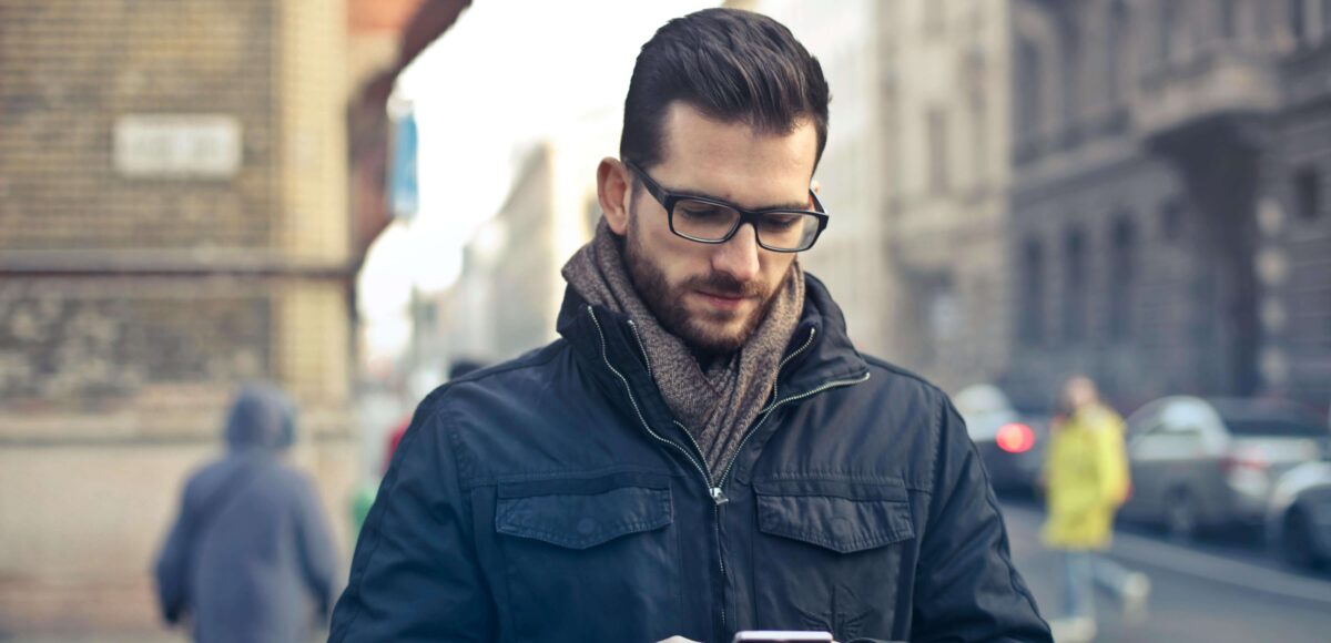 Foto von Andrea Piacquadio: https://www.pexels.com/de-de/foto/mann-der-schwarze-reissverschluss-jacke-halt-smartphone-halt-umgeben-von-grauen-betongebauden-775091/